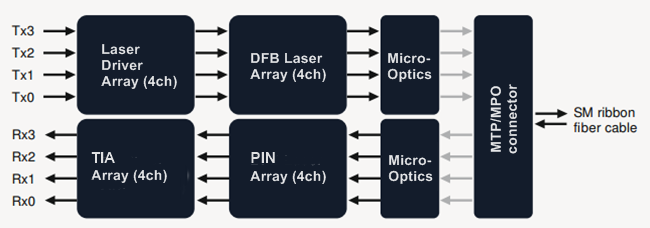 4 uncooled 1300nm CWDM directly-modulated lasers (20nm wavelength spacing) |