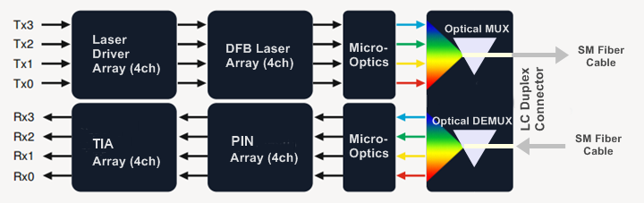 The central wavelengths of the 4 CWDM channels are 1271, 1291, 1311 and 1331 nm, which comply with CWDM wavelength grid defined by ITU-T G694.2. Each wavelength channel is collected by a discrete photodiode and output as electric data after being amplified by a trans-impedance amplifier (TIA).