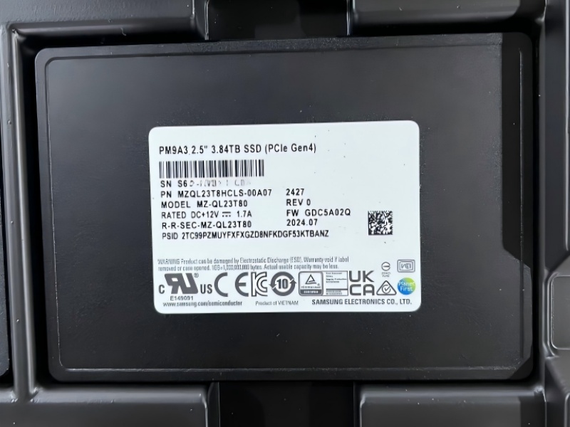Part of Samsung’s trusted PM9A3 series, this SSD is engineered to meet the rigorous demands of AI and data center environments. Key specifications include a 2.5-inch form factor (U.2 interface) for seamless server integration, 3.84TB of large capacity to store extensive AI models and datasets, and PCIe Gen4 x4 NVMe technology that delivers blazing-fast performance. It boasts sequential read speeds up to 6800 MB/s and random read speeds of 1000K IOPS, ensuring smooth data access even during intensive AI workloads .