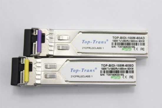 read moreTop-Trans 155M BIDI 1310nm/1550nm Transceiver Small Form Factor Pluggable (SFP) transceivers are compatible with the Small Form Factor Pluggable Multi-Sourcing Agreement (MSA). The SFP transceivers are high performance, cost effective modules supporting SONET OC-3/SDH STM-1 and 60km transmission distance with SMF. They are RoHS compliant and lead-free.